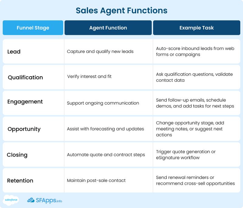 A Salesforce agent works best when its actions align with each stage of the sales funnel. From first contact to renewal, each activity can be automated or supported by your agent to keep deals moving forward.