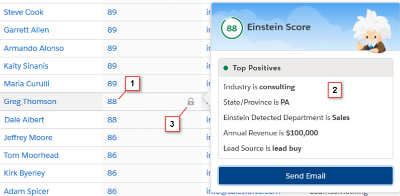 When you or your team add the Einstein Score field to your list views, you can hover over a score (1) to see the main reasons (2) behind it. This helps sales reps focus on leads with higher scores, which are more likely to turn into opportunities. The lock symbol shows that the score canāt be changed, itās read-only (3).