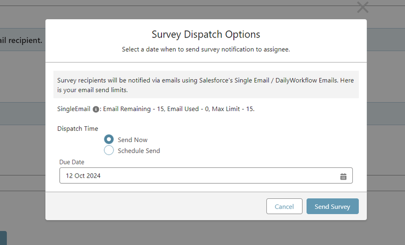- Once the recipients are selected, click on the Send Survey button to dispatch the survey to the chosen users.