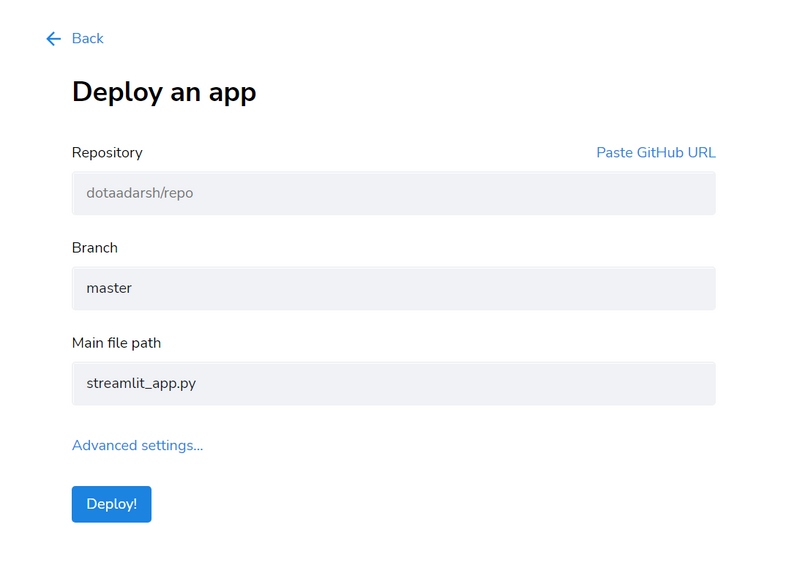 - To deploy an app, click "New app", then fill in your repo, branch, and file path, or click "Paste GitHub URL" and click "Deploy".