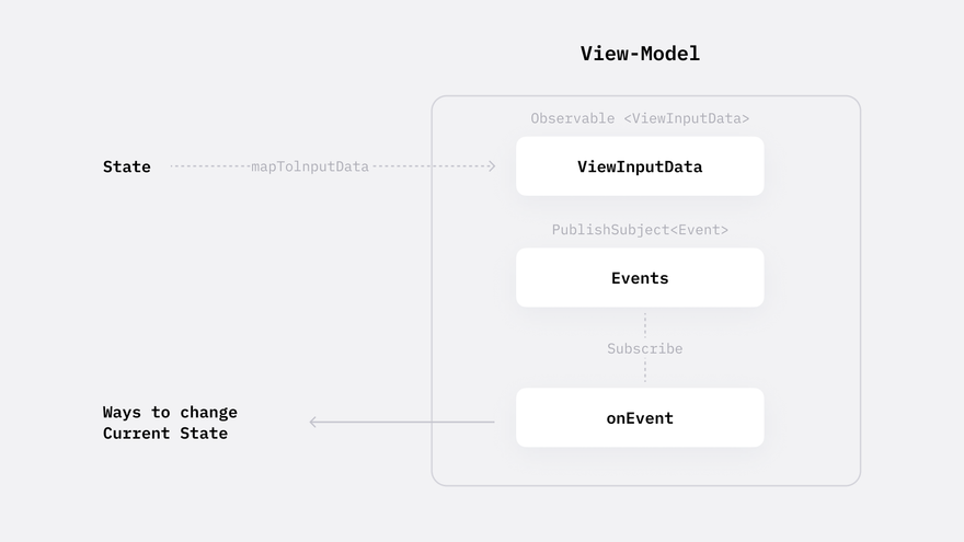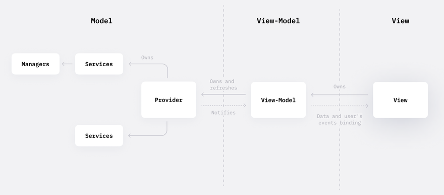 ViewModel – The mediator between the Model and View. It is responsible for changes of Model, reacting on user’s actions performed on View, and updates View, using changes from Model. The main distinctive feature from other intermediaries in MV(X) patterns is the reactive bindings of View and ViewModel, which significantly simplifies and reduces the code of working with data between these entities.