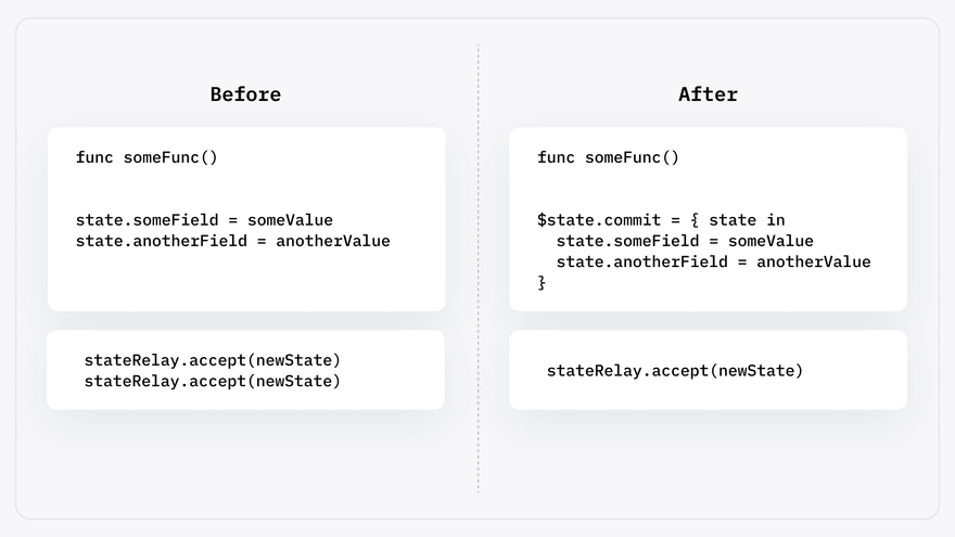 We’ve mentioned that we had made the provider State with the custom propertyWrapper — RxPublished. It’s an alternative to Published in Combine, but in RxSwift. It “wraps up” BehaviorRelay so when we modified State we sent out an instance to the subject. And only after that the subject delivered it to its subscribers. But there was a case when we needed to update several state fields, but deliver the updated state only when the operation was completed.