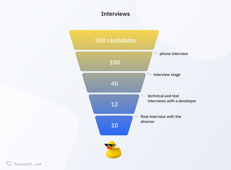 - Out of 40 candidates, 30% go through the technical and test interviews with a developer—12 people.