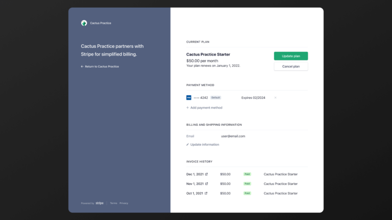 - Add Stripe Customer Portal to have your users manage their subscription and change the payment method on their own