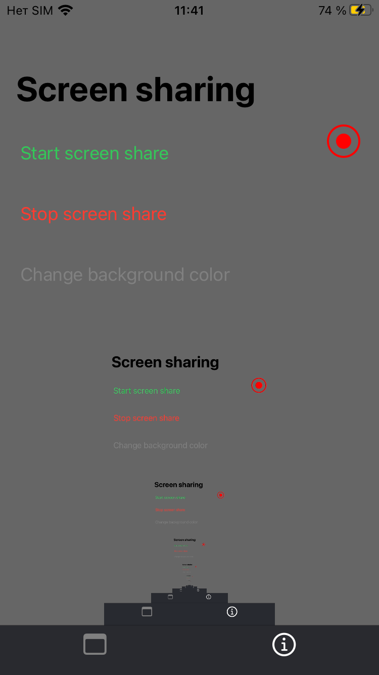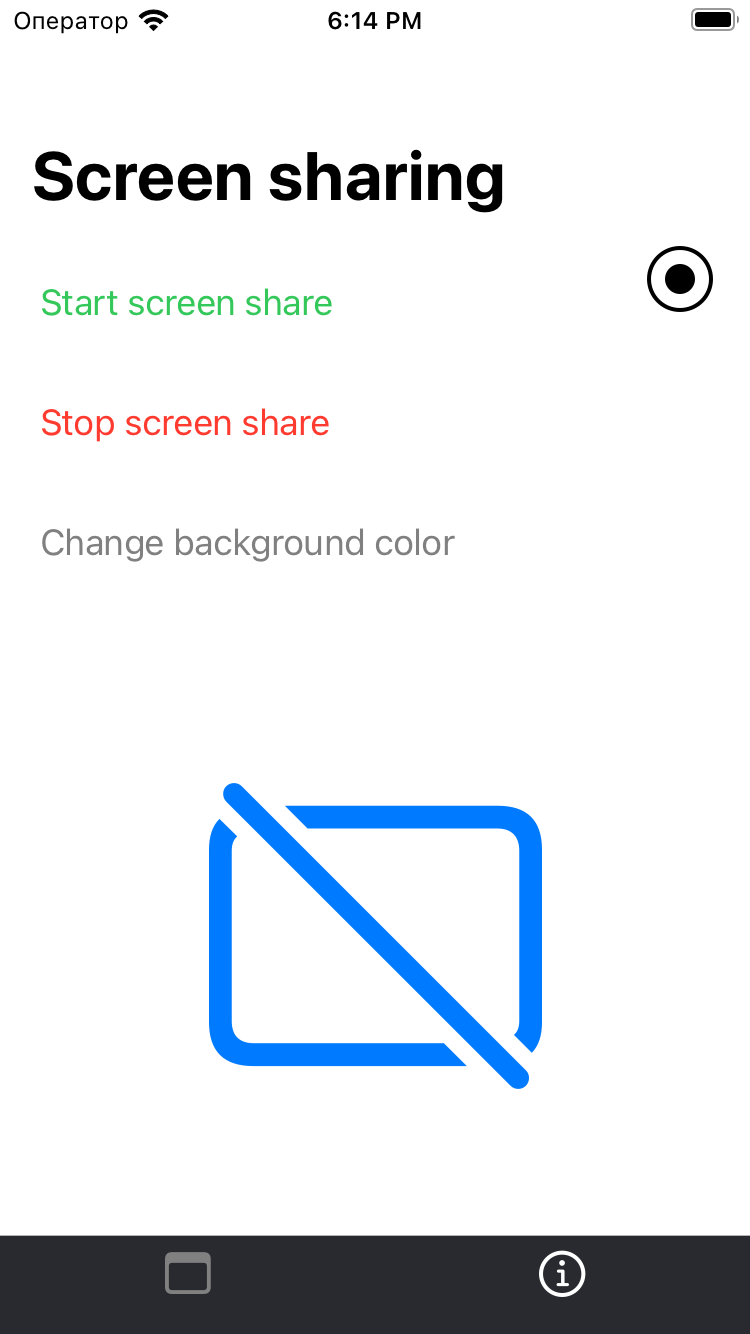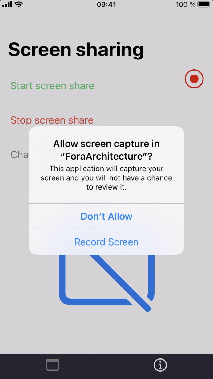 - Screen sharing with extensions. This approach enables screen sharing from almost any point of the OS: e.g. Homescreen, external apps, system settings. But the implementation might be quite time-consuming.