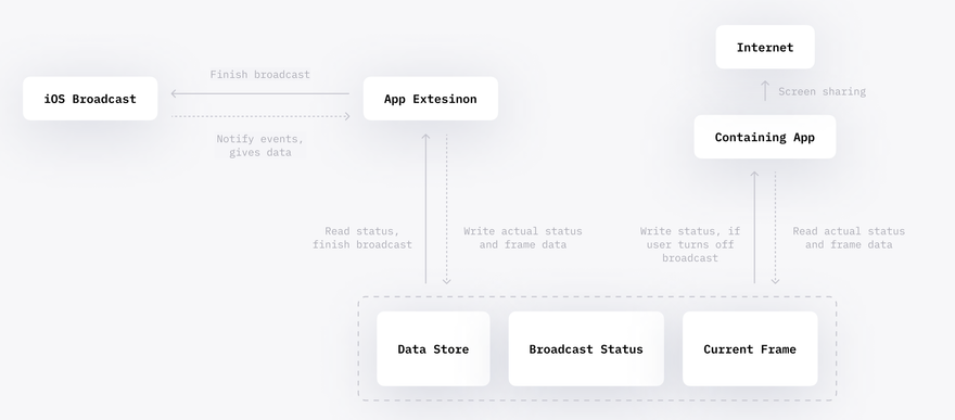 Once a user taps “Start broadcast” the broadcast will start and the selected extension will process the state and the stream itself. But how will the Containing App know this? Since the storage container is shared, we can exchange data via the file system - e.g. UserDefaults(suiteName) and FileManager. With it we can set up a timer, check up the states within certain periods of time, record and read data along a certain track. An alternative to that is to launch a local web-socket server and address it. But in this article we’ll only cover exchanging via files.