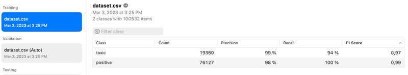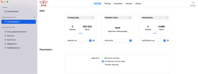 To begin with, launch the CreateML tool (it's already in XCode) and create a new project. Select TextClassification (Apple uses BERT) and create a project. You'll see a window for uploading the prepared data.