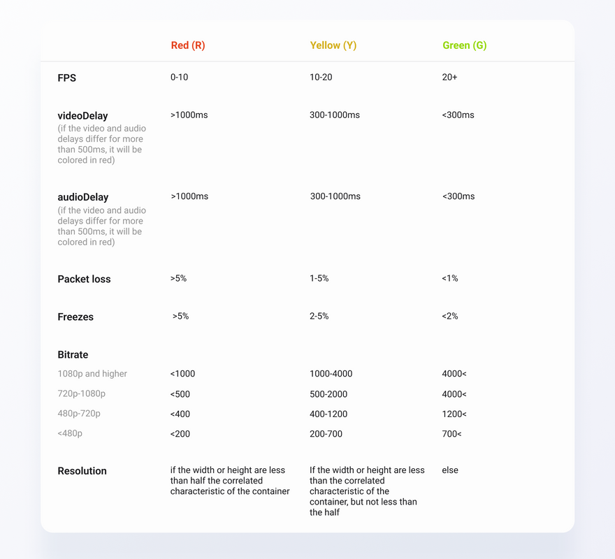 – Video and Audio delay. Delay is never welcome, so the lower the better. Basically it’s a sum for jitterBufferDelay and average round trip time. Totals are relevant for the last 3*X seconds, where X is the time set in setInterval.