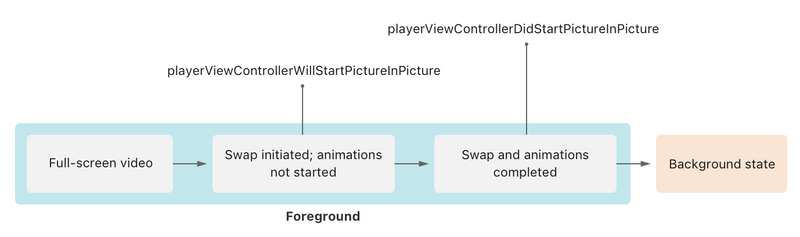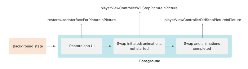 An event occurs that initiates the transition from PiP to full-screen mode and stops the Picture in Picture mode β such as pressing a button or expanding the app. The app enters the foreground.