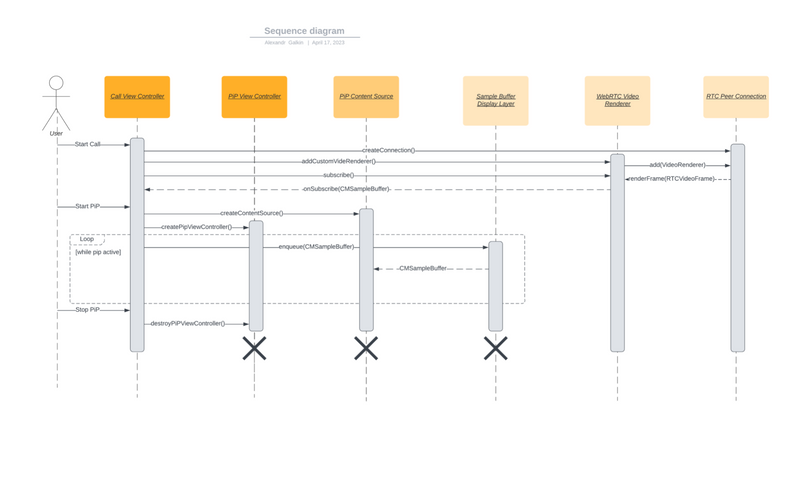 Implementing Picture in Picture mode in an iOS app for video calls using WebRTC technology is perhaps the most challenging part of the work. We would be happy to help you with it, so please reach out to us to discuss the details. Conceptually: