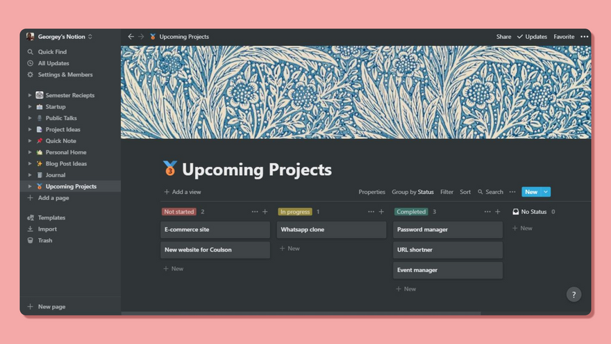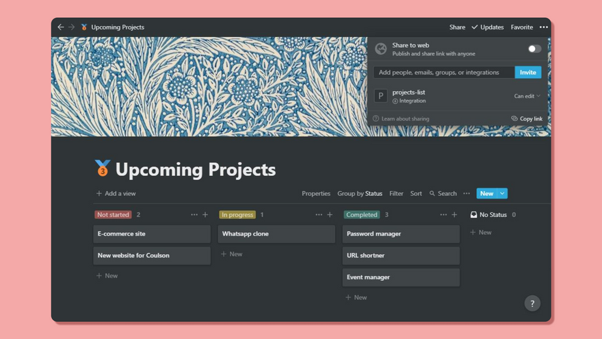 There are lots of templates and different databases available. Here we will be building a project database using the kanban board. Next time whenever you complete an ongoing project, move it to the "Completed" section, and you can see the change instantly on your website.
