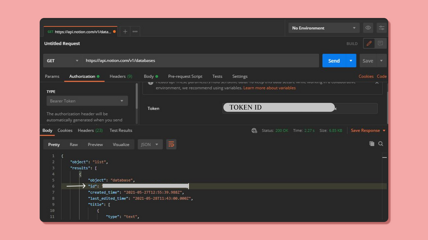 There are 2 ways to find this out, either you can use Postman (or any other API testers) and make a GET request to https://api.notion.com/v1/databases with the Bearer Token ( the Token ID).