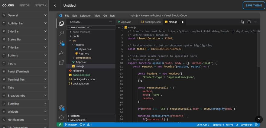 After customizing everything, save the theme -> Go to Your Themes -> Download. The file that gets downloaded is the theme_name.json you made in the themes/theme_name.json directory. Simply open the file you just downloaded, copy the content and paste it into your VSCode file.