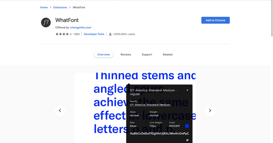 To try WhatFont, search for ‘whatfont extension’ on your search engine. Choose the link that takes you to your browser extension section. For me, I use Chrome. Here’s what it looks like: