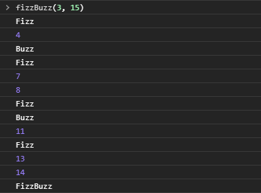 Now we run it… (if you don’t know how the fastest way is to right click in your browser, click inspect, at the top of the window that pops out click console, copy your code and paste it in that window. then run a test ex: fizzBuzz(3, 15) )