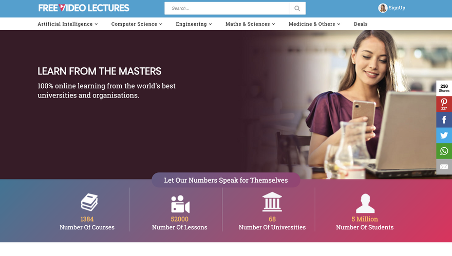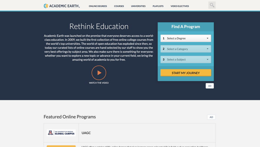 Academic Earth has launched on the premise that everyone deserves access to a world-class education. In 2009, we built the first collection of free online college courses from the world’s top universities. The world of open education has exploded since then, so today our curated lists of online courses are hand-selected by our staff to show you the very best offerings by subject area. We also make sure there is something for everyone: whether you want to explore a new topic or advance in your current field, we bring the amazing world of academia to you for free.
