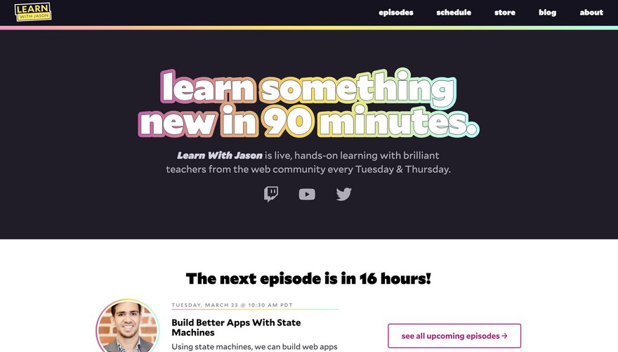 Learn with Jason is live, hands-on learning with brilliant teachers from the web community every Tuesday & Thursday. Jason Lengstorf invites other developers and you can join live coding sessions every week. You can learn Typescript, Next.js, Vue, D3, Serverless Functions, and much more by one of the best developers in the industry.