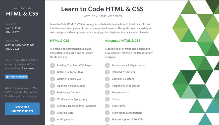 Learn to Code HTML & CSS has one goal — to teach people how to build beautiful and intuitive websites by way of clear and organized lessons. The guide covers a variety of web design and development topics, ranging from beginner to advanced skill levels.