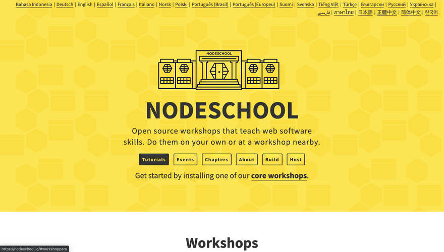 Open source workshops that teach web software skills. Do them on your own or at a workshop nearby. You can join Node.js workshops for free and work with mentors.