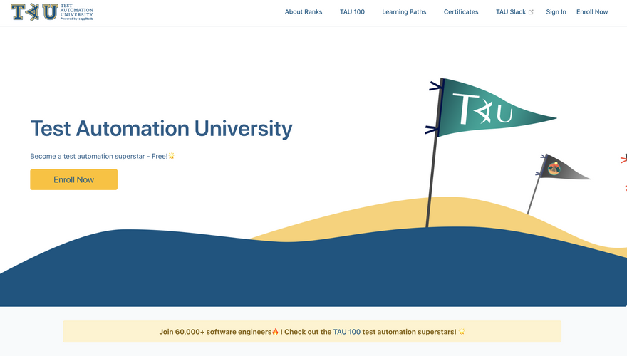 Here you can learn all about testing in Javascript, Java, C#, Ruby, Python, Swift, no-code solutions, and QA testing. You can enroll for learning paths and it's totally free.