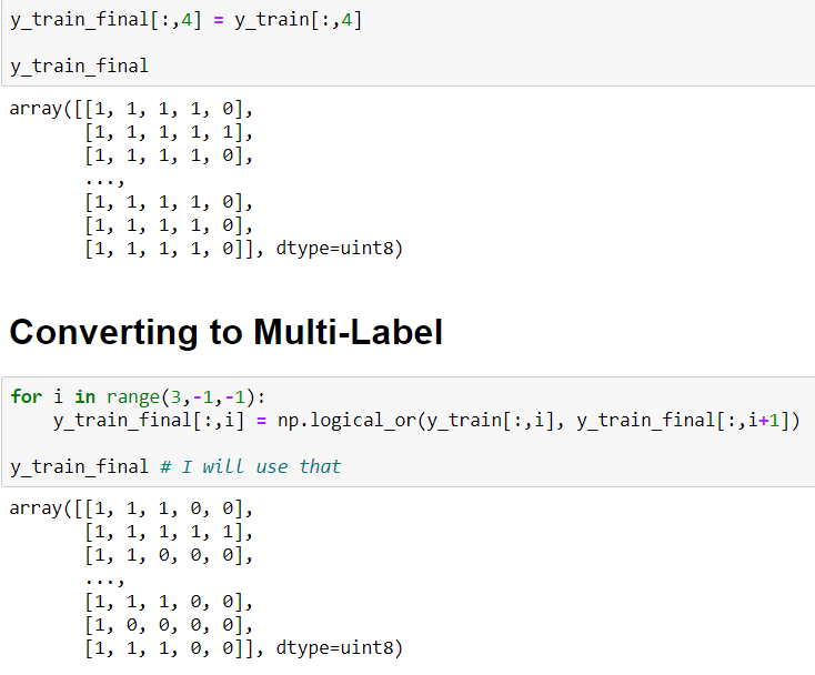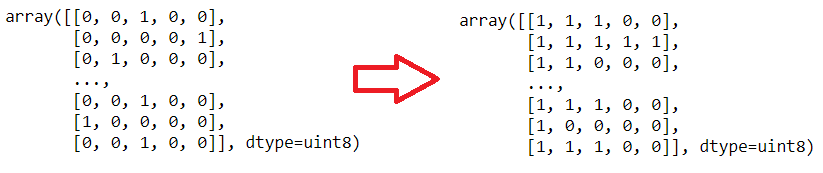 In order to convert that I will use a simple for loop and I will use np.logical_or() method. This method computes the truth value of x1 OR x2 element-wise.