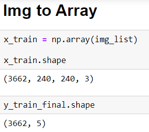And now I am ready to define the transfer learning model but first I need to transform my images into arrays. It is so simple with this method np.array()