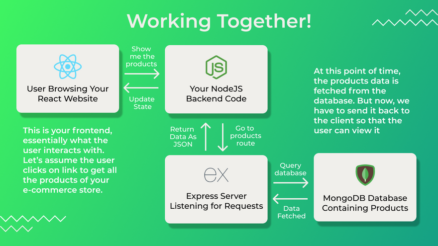 In the previous section, we had look at all the 4 technologies which constituted the MERN stack. While each one of them is amazing to work with individually, the combination of these technologies working together like a clockwork results into an amazing web application. That's what we're going to learn about in this section. Knowing the each individual technology is half the skill, while the other half is to piece them together into something meaningful. What could be better than another visual representation of a MERN stack web application, where the user is interacting with the frontend which in turn is accessing the backend and the database.