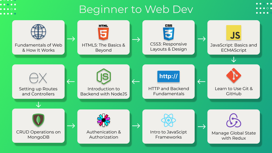 Phew! That was a lot to take in, wasn't it? But the good thing is that you don't need to memorise any of it. Developers learn by doing, not memorising! With that being said, you must be wondering how to become a MERN stack developer. And that is going to be the prime focus of this section, where I'll be providing you with my own roadmap which you can take inspiration from and start your journey, whether you are new to web development or just exploring other tech stack.