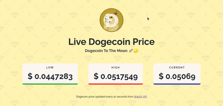 In this project, we will be building a simple Dogecoin price ticker, a web app which will fetch the lowest price of the day, the highest price of the day and the last traded price via an API and will be updated every 10 seconds. Throughout the project, you will learn about setting up a React project, building components, props, state and the most used React hooks such as useState and useEffect.
