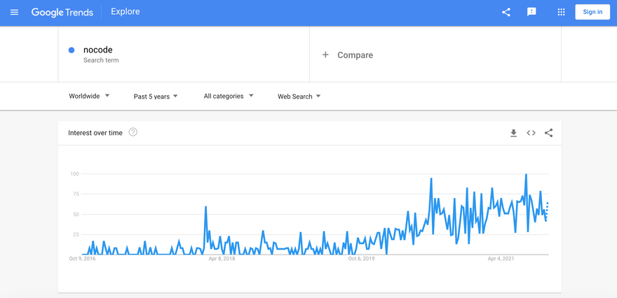 I saw on Google Trends that the “nocode” key word is finally taking off. This is to be expected. But what’s fascinating and interesting is under related queries, “github nocode” is one of the top breakout queries.