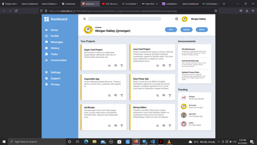 The project is an Admin dashboard that makes use of CSS grid and flexbox.This is what I'm to do.