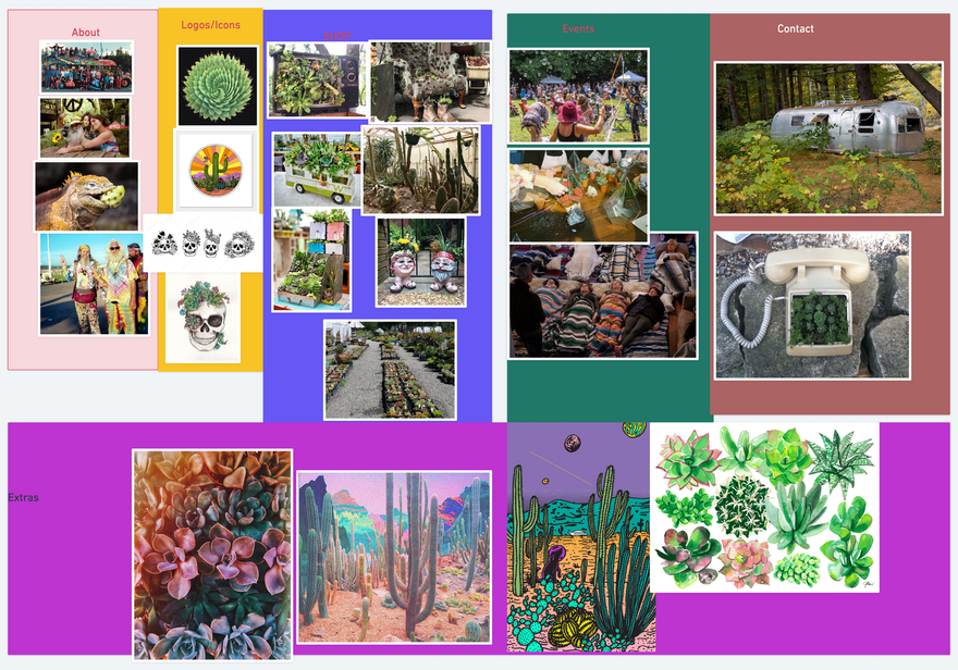 Alright, now I got a lot to work with! Now it’s time to piece together some visual ideas. To do this I first made a mood board. My google search history is pretty funny now — psychedelic succulents, 3 old hippies, old beat-up airstream, succulent phone, trippy colors, etc. This is what I came up with: