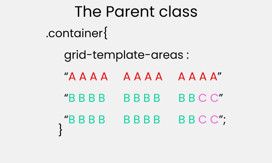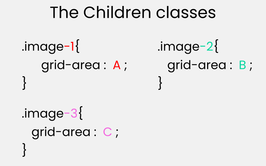 At first, we need to setup grid-template-areas βοΈ Once done, we have to specify the names used in parent class inside the children classes, like thisπ