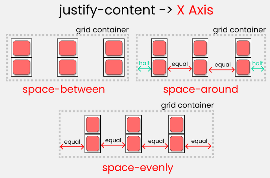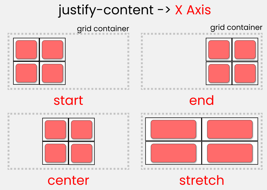This is used to position grid-items (children) inside grid container along the X-Axis[Main Axis]. The 4 values are π