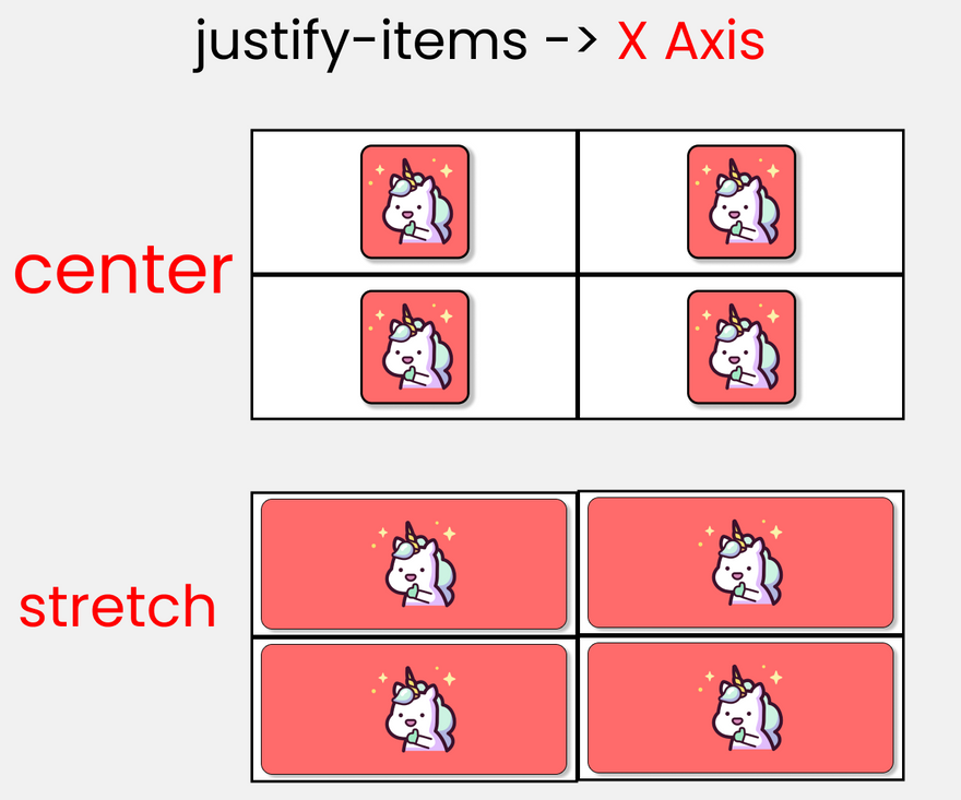 This is used to position 1 individual grid-item (children) inside grid container along the X-Axis[Main Axis]. The 4 values are π
