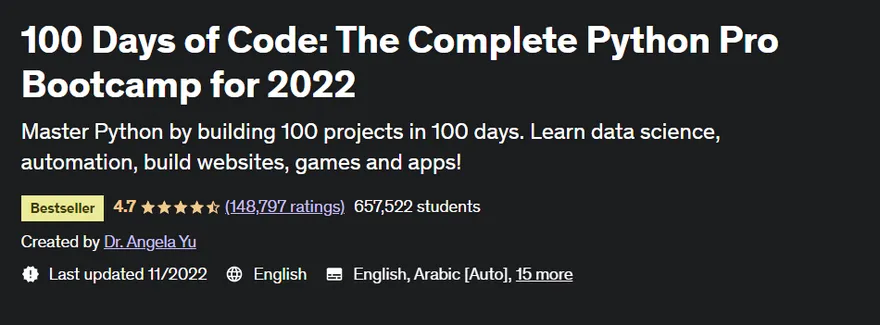 Welcome to the 100 Days of Code - The Complete Python Pro Bootcamp, the one and only course you'll ever need to learn to code in Python. My courses have over 500,000 5 STAR reviews and a 4.8 average, making them some of the HIGHEST RATED courses in Udemy history!