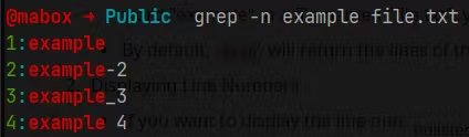 If you want to display the line numbers of the matches in the file, you can use the n or -line-number option. For example, to search for the word "example" in a file named "file.txt" and display the line numbers, you would use the command: