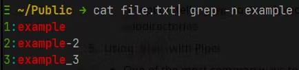 grepis in combination with other Linux commands, through the use of pipes. Pipes allow you to send the output of one command as the input to another command.For example, to search for all files in the current directory that contain the word "example", and then print the file names along with the line number of the match, you could use the command: