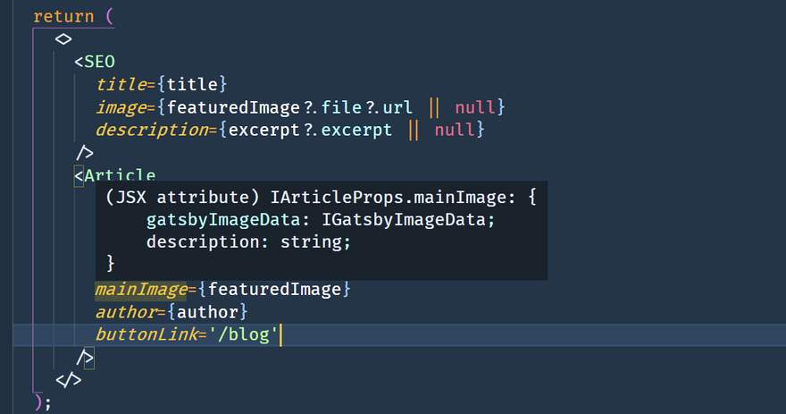 I also decided to use TypeScript to reduce the risk of bugs when passing props down to variuous components - but also because using TypeScript gives me incredibly useful information in VS Code during coding:
