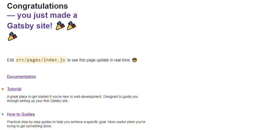 When everything is set up, you will get a page that looks something like this when entering gatsby develop on the command line and visiting http://localhost:8000: