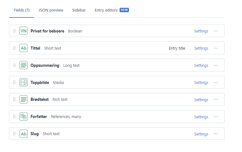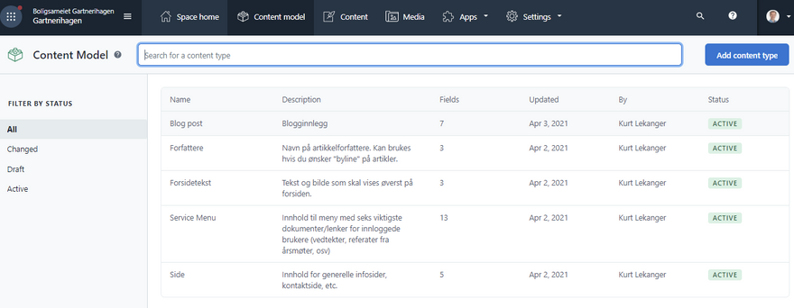 But before I could see my data in GraphiQL, I had to set up everything in Contentful. I first had to define a Content model, which is a description of the different types of content - and what fields should be available for each content type. For example, I have a content type called Blog Post, which contains fields such as Title, Summary, Top Image, Body Text and Author. For each of the fields you must define the type of the content - such as text, numbers, boolean values, media (images, video, etc). You can also create references between different types of content, for example links between a blog post and one or more authors (where Author is a content type as well).