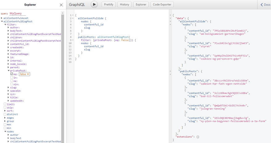 When you have installed and configured the plugin, you can visit localhost:8000/__graphiql to create the GraphQL queries. In the left column of the GraphiQL interface you get a view of all available data (including content from Contentful). The middle column is for creating the queries - and the column on the right shows the result of a query after you press the Run button. GraphiQL makes it very easy and straightforward to test different queries and check that you get back the data you expect, before copying the query into your code.