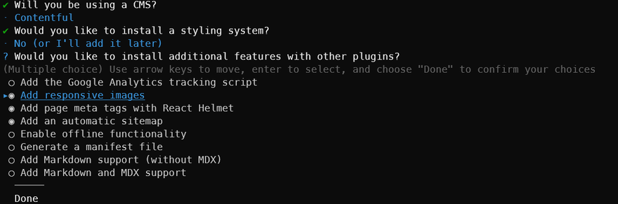You will be asked which CMS you want to use for storing the content, and can choose between Wordpress, Contentful, Sanity, DatoCMS, Shopify or Netlify CMS. You can use almost anything else with Gatsby as well - but Gatsby can set up a number of things for you automatically if you choose one of the predefined options. You will also be asked if you want to have a specific styling system pre-installed, such as Sass, Styled components, Emiton, PostCSS or Theme UI.