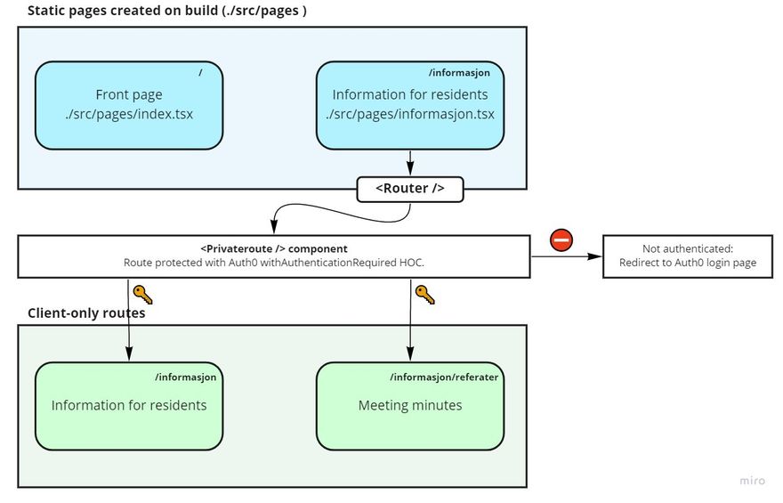 In the code example above, every path (url) ending in /informasjon and /min-side ("My page" in Norwegian) will not be static pages, but render the routes I have set up in src/pages/informasjon.tsx or src/pages/min-side.tsx. On the condominium's website, there is a menu item on the navigation bar called For residents that navigates to https://gartnerihagen-askim.no/informasjon. To create this client-only route in Gatsby, I created the file src/pages/informasjon.tsx and used Reach Router to display different React components depending on the route. For example, if the user visits the web page on the route /informasjon/dokumenter, the <Dokumenter> component should be displayed.
