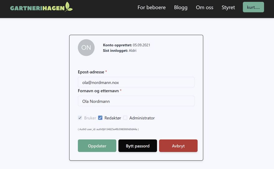 I won't go into all the details about everything I do on the client to update the user information, it's basically just pre-filling a form with info about the user we are going to edit, and then in case of changes to any of the fields in the form use setUserDataForm to update state (much like we did in the new user creation form). This is the screen you get when you press Change user:
