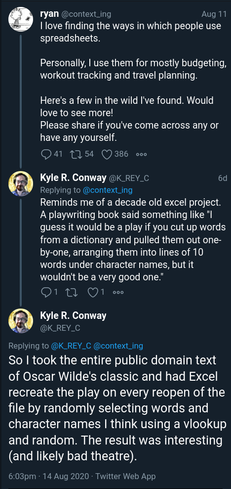 I felt compelled to reply with my own little story. “Reminds me of a decade old excel project. A playwriting book said something like “I guess it would be a play if you cut up words from a dictionary and pulled them out one-by-one, arranging them into lines of 10 words under character names, but it wouldn’t be a very good one.” So I took the entire public domain text of Oscar Wilde’s classic and had Excel recreate the play on every reopen of the file by randomly selecting words and character names I think using a vlookup and random. The result was interesting (and likely bad theatre).”
