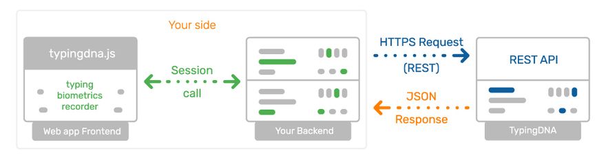 In terms of implementing it, it's a three-part system. The first part is a recorder (TypingDNA provides this) that lives in your application and records the way users type when they perform a certain action, like logging in. The second part is your own back-end server application, and that's where the recorder sends the biometrics data. For the final step, you check that data against the saved biometrics TypingDNA has, using their REST API.