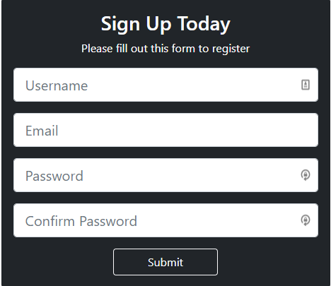 For this project, I created a sign-up form using the code snippets from the bootstrap documentation and gave the form a dark color. As you might expect, you can also find this project on CodePen and GitHub