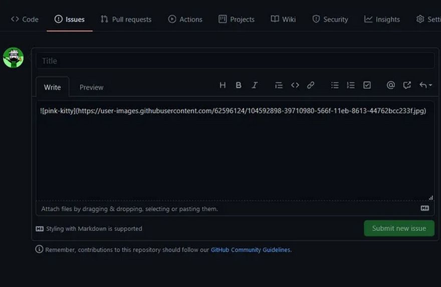 Instead of writing an issue report, drag an image to the issue box. Github will save the image as a png file and show a link in markdown format like this: