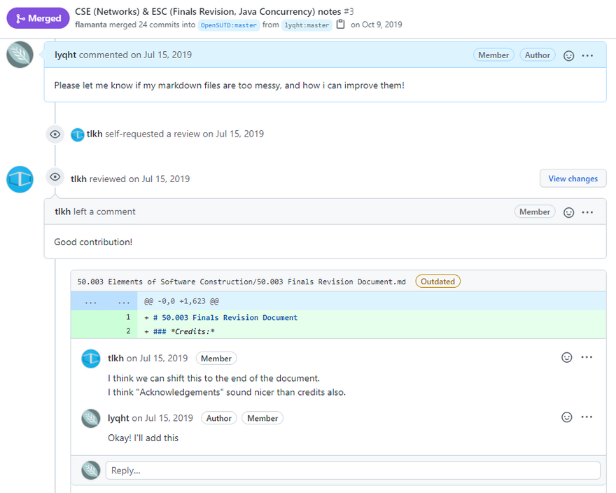 However, it was only until the second year of my university where I started writing notes for more technical courses, which included mathematics and of course - computer engineering/programming related stuff. It was also then that I got to know of some cool folks that started an open source community within the university called OpenSUTD. They organize a lot of events and initiatives in school, and one of them included a course notes platform for people to contribute to. However, the course platform didn't have a UI for people to contribute their notes easily like owlcove.sg, as the people behind OpenSUTD were staunch advocates of using GitHub and insisted on using it for communication as well. So I learnt how to create a pull request (I was still new to programming and never used GitHub beyond just uploading single-commit repositories) and made my first pull request. I was lucky enough to get a reviewer who gave me a lot of tips on improving my writing.